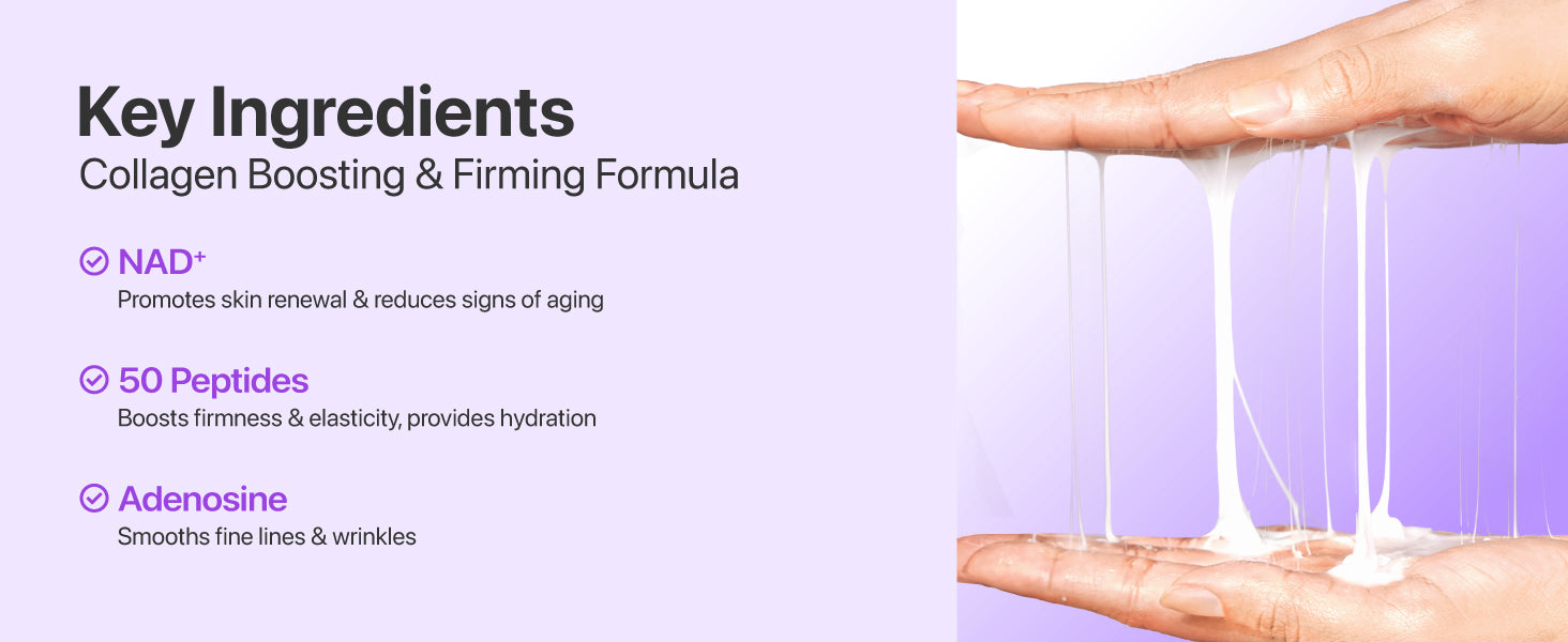 [KEY INGREDIENTS] Formulated with NAD+, an anti-aging ingredient that enhances cell turnover, stimulates collagen production, and promotes skin repair along with 50 types of peptides to plump and firm the skin.