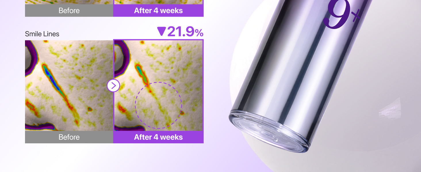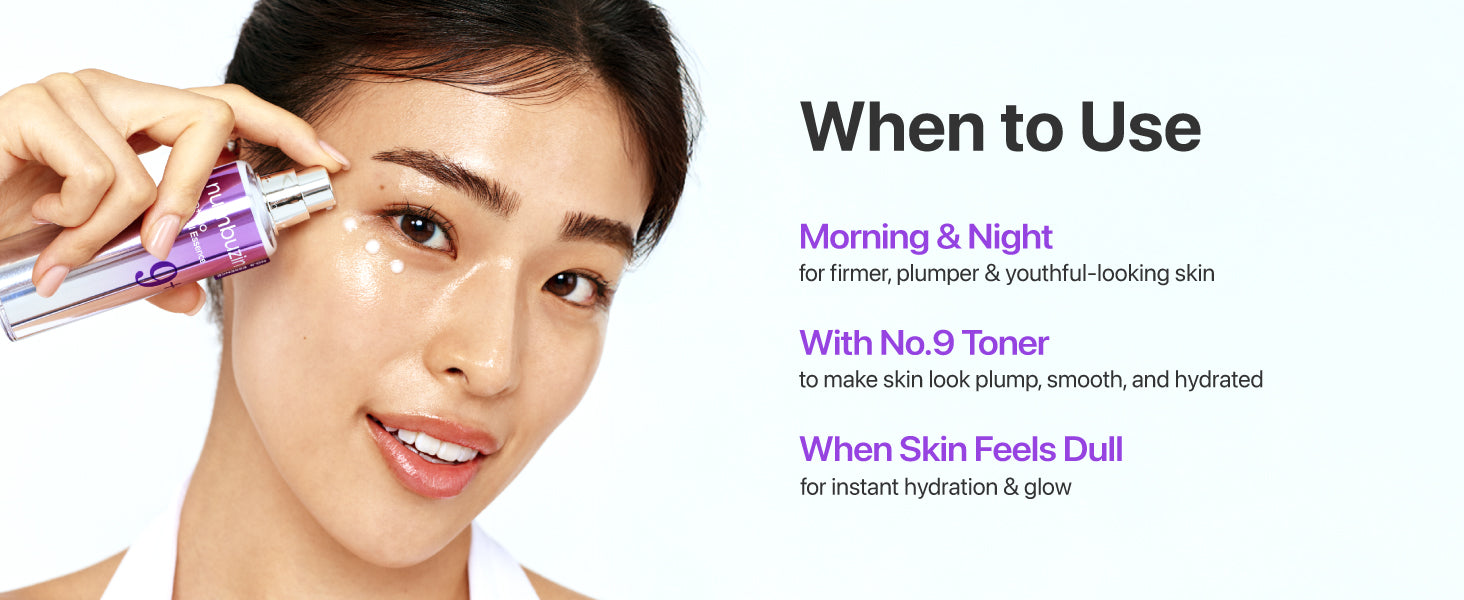[PRO TIP] Intensive wrinkle spot care routine with No.9 essence. Use it all over your face and apply it again on areas for wrinkles concerns – especially smile lines, frown lines, and forehead. Then, gently massage into the skin until it is absorbed.